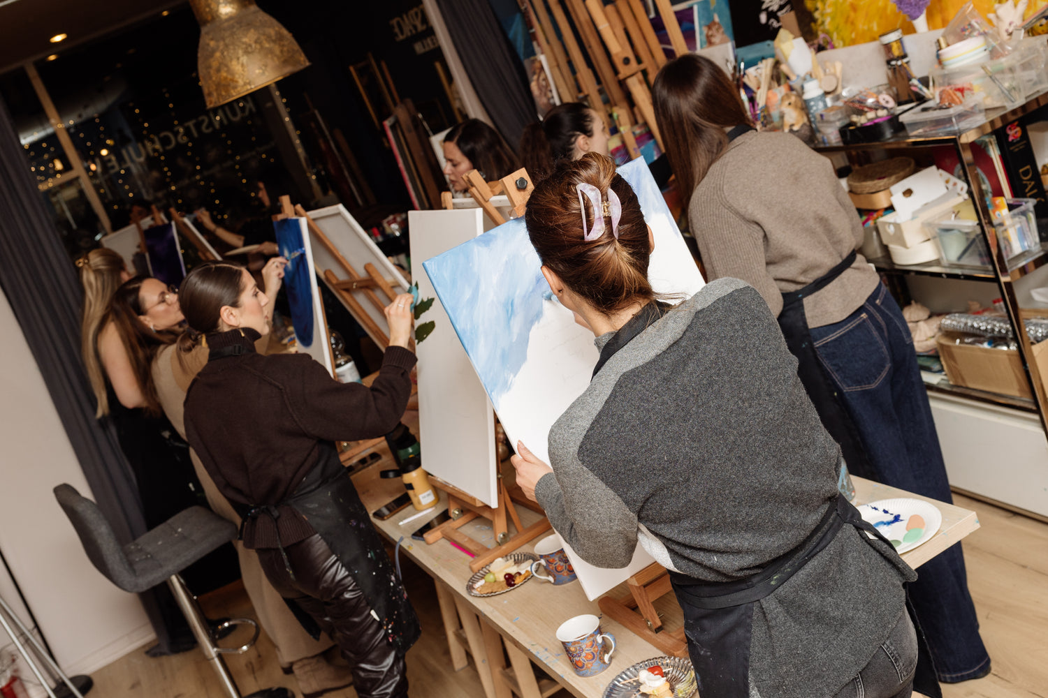 In unserem Atelier können alle Teilnehmenden ein gemeinschaftliches Gemälde gestalten, das dann einen Platz in der Büroräumen der Firma finden kann.